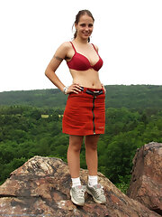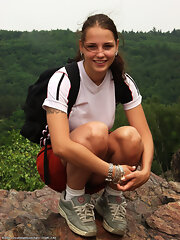 Polly is outside in her forest in her blue dress. She teases the camera to show her pink panties and has fun. Off comes her clothes as she relaxes on her blanket and then as she stands in the sunshine.