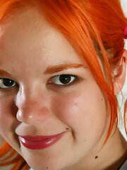 Redhaed plump older babe takes off dress and shows hairy pussy