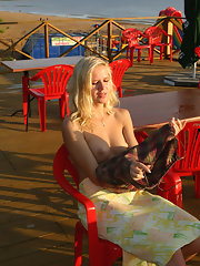 Nina Devon likes to show her stuff on the patio. So she walks outside wearing her shades. But once she gets in the shade of the patio it\'s time to flash her tits and then play with her hairy pussy.