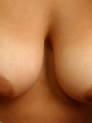 Gunita is standing in her black lingerie and stockings, and showing off her body. She slowly undresses and shows her 34B breasts and hairy pussy. She lays back to touch herself and enjoy herself.